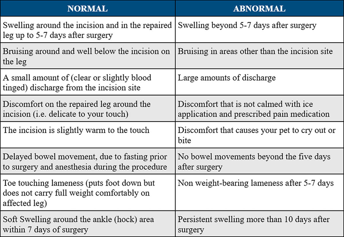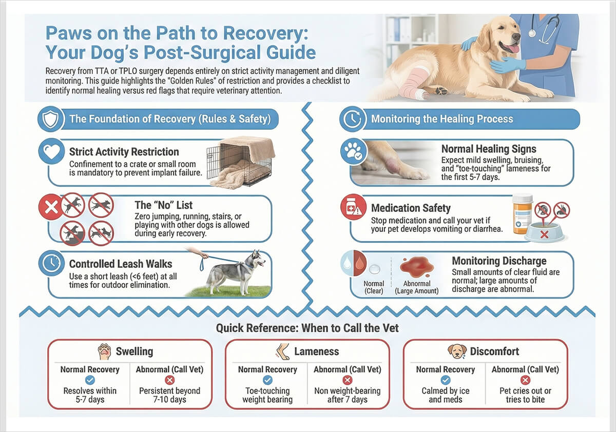 Successful surgical outcomes depend heavily on postoperative care and owner compliance. Controlled activity, structured rehabilitation, and close observation are essential to protect the surgical repair and promote optimal healing.