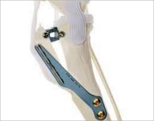 TTA requires a linear cut along the front of the tibia. The front of the tibia is moved forward to neutralize forces around the knee. The cut in the bone is stabilized using a specifically designed wedge, bone plate, and screws.