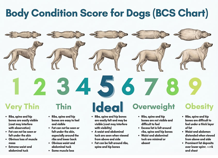 Weight Management: Maintaining your pet at an ideal body weight is the most effective way to enhance both lifespan and quality of life. Research demonstrates that dogs kept at a healthy weight can live up to 15% longer than those who are overweight—equivalent to as much as two additional years for a Labrador Retriever-sized dog. We utilize a standardized body condition scoring system, rating your pet on a 9-point scale, with a score of 5 representing optimal health. If your dog’s score exceeds 6, a specialized weight management diet is strongly recommended. Excess body weight significantly increases the risk of osteoarthritis and other joint-related conditions. For personalized guidance and a tailored weight loss plan, please consult your primary care veterinarian.