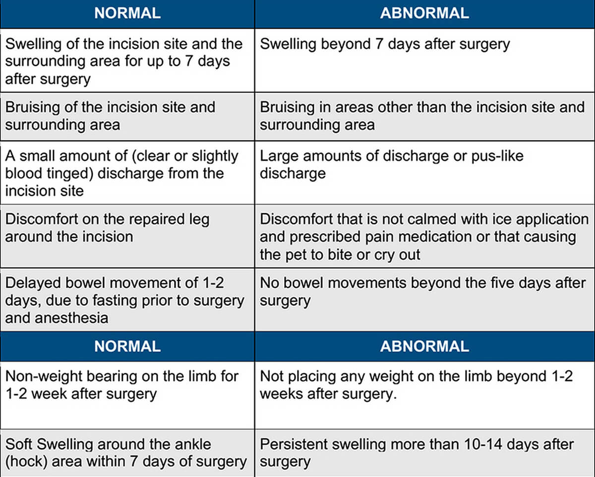 - Limping is normal after surgery; gradual improvement in weight-bearing on the surgical leg should occur each week.